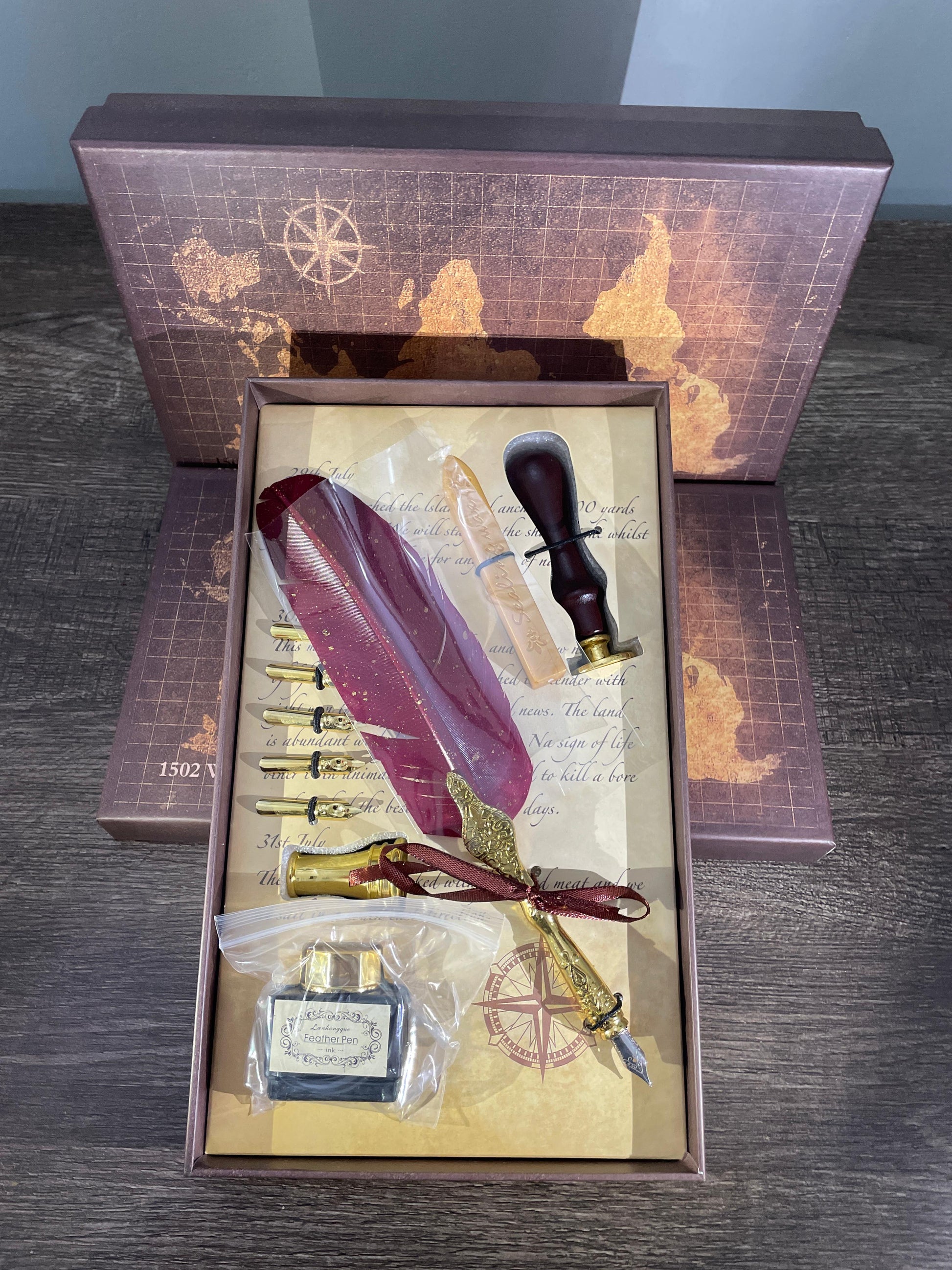 - Our premium Feather quill pen set with ink,candle,pen holder and stamp including 5 gold nibs in red feather.